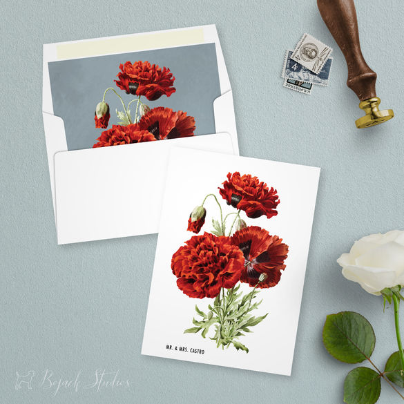 We offer a wide variety of complimentary customizations. Fonts, wording, monograms, & belly bands can be customized, and some artwork can be changed at no cost. Multiple ink colors are available at no charge (flat printing). You can add foil to any card for an additional charge. For more info, visit our customization guide.