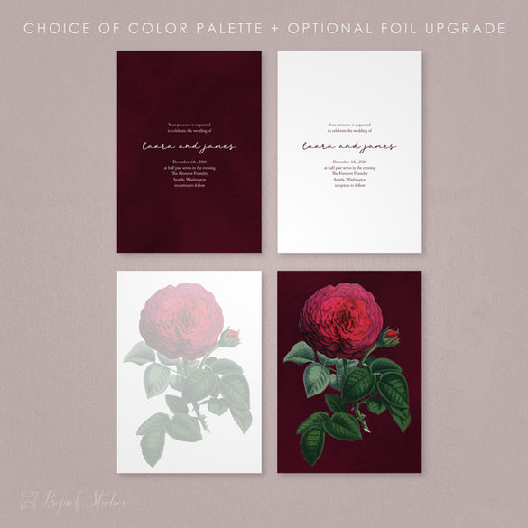We offer a wide variety of complimentary customizations. Fonts, wording, monograms, & belly bands can be customized, and some artwork can be changed at no cost. Multiple ink colors are available at no charge (flat printing). You can add foil to any card for an additional charge. For more info, visit our customization guide.