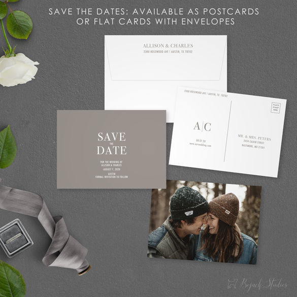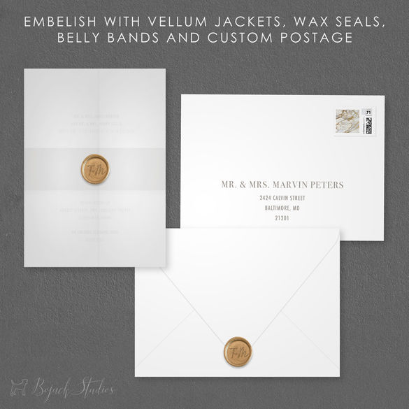 All of our invitations are printed using archival inks and high quality paper stock on a commercial press. Invitations are available as a customized Build Your Own Suite - choose the pieces that make sense for you.
