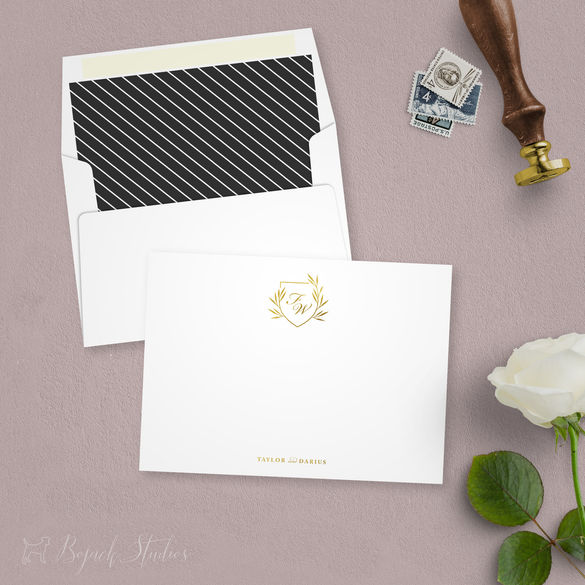 We offer a wide variety of complimentary customizations. Fonts, wording, monograms, & belly bands can be customized, and some artwork can be changed at no cost. Multiple ink colors are available at no charge (flat printing). You can add foil to any card for an additional charge. For more info, visit our customization guide.